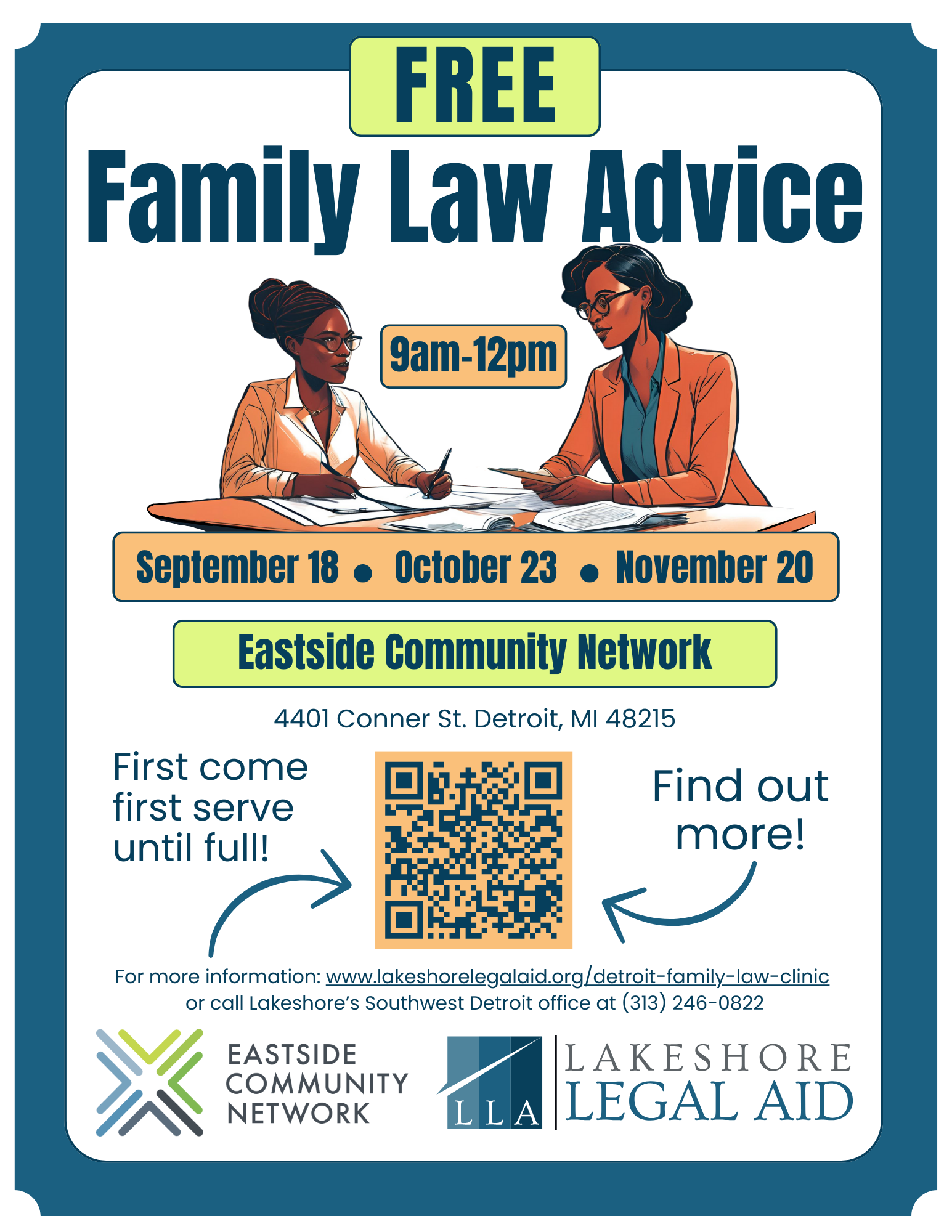 Lakeshore is hosting family law clinics at Eastside Community Network from 9am to 12pm on September 18, October 23, and November 20. To find out more, please use the QR Code or click on the below button.